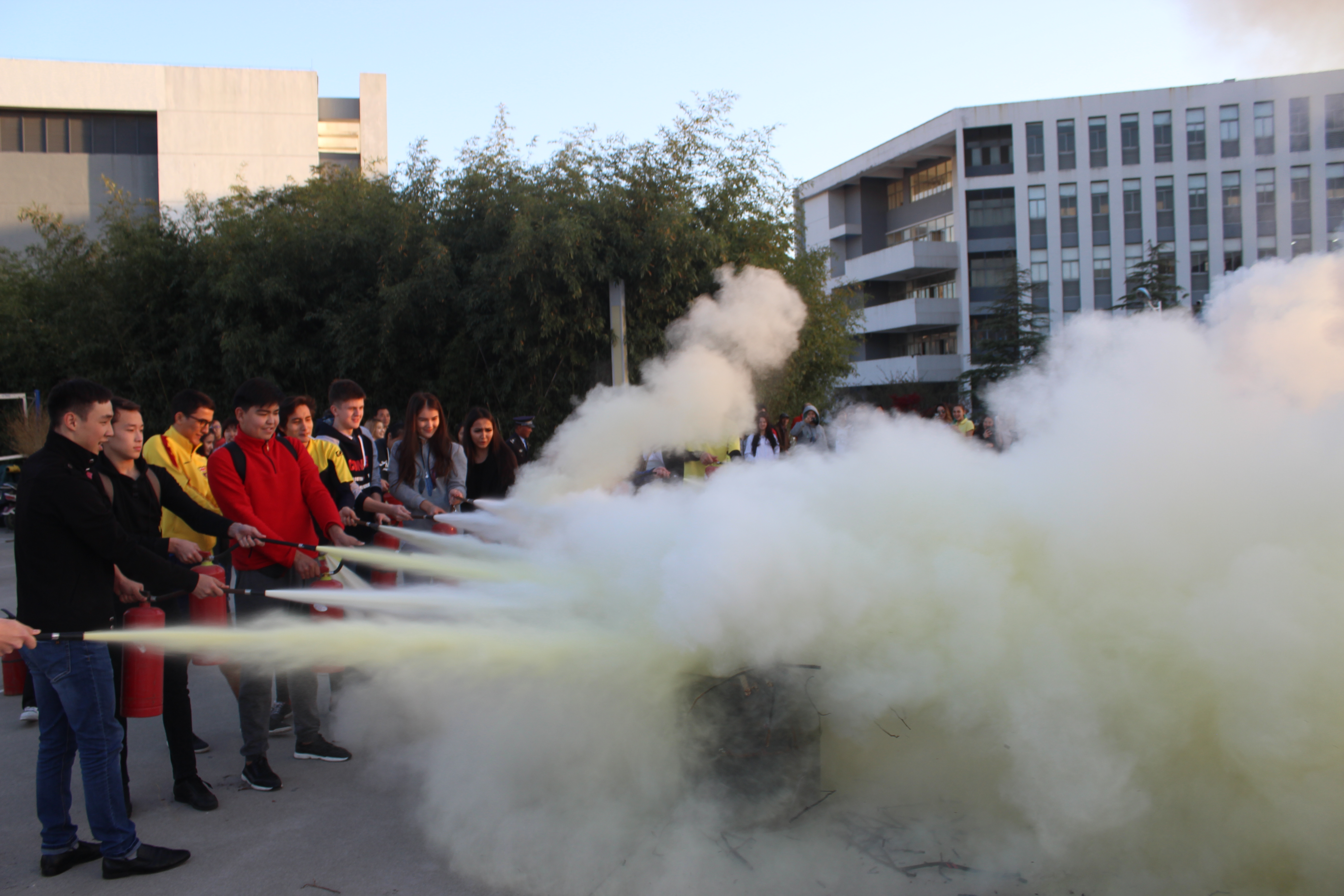 11月9日下午,保卫处、国合处又组织100多名2017级留学生在学校东篮球场开展消防灭火演练,所有参训人员按照操作要领分组使用灭火器,在规定的距离,对着火盆的根部猛烈喷射,迅速扑灭油桶火,有序完成了演练任务。